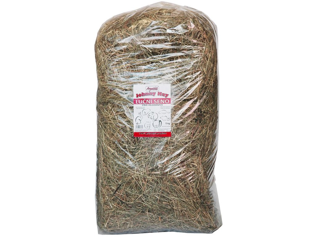 Apetit - JOHNNY HAY Luční seno 5 kg je krmná surovina, která tvoří nezbytnou součást krmné dávky pro zakrslé králíky a hlodavce. Toto luční seno je klíčové pro zajištění dostatečného množství vlákniny, čímž podporuje správné a lepší trávení těchto zvířat. Může být podáváno v neomezeném množství spolu s dostatkem čerstvé pitné vody.