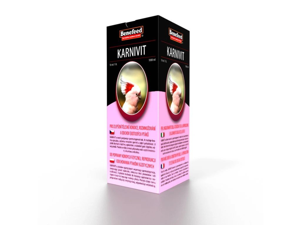 Benefeed Karnivit Exot je vysoce účinný tekutý přípravek s L-karnitinem a vitamíny, který výrazně zlepšuje reprodukci a zdraví mláďat u exotického ptactva. U samců podporuje kvalitu spermií, u samic lepší oplodnění a u ptáčat pak vyšší vitalitu a nižší úmrtnost. Je ideální pro období páření i pro podporu růstu svalové hmoty u mladých ptáků.