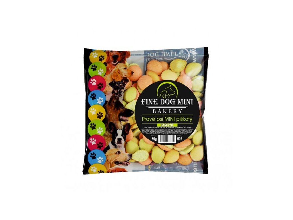 Fine Dog Pravé Psí MINI Piškoty Barevné jsou doplňkové krmivo ve formě tradičních piškotů, určené nejen pro psy. Klíčovou vlastností je jejich složení se sníženým obsahem cukru a lepku, což z nich dělá vhodnější a lehčí odměnu pro vašeho mazlíčka.