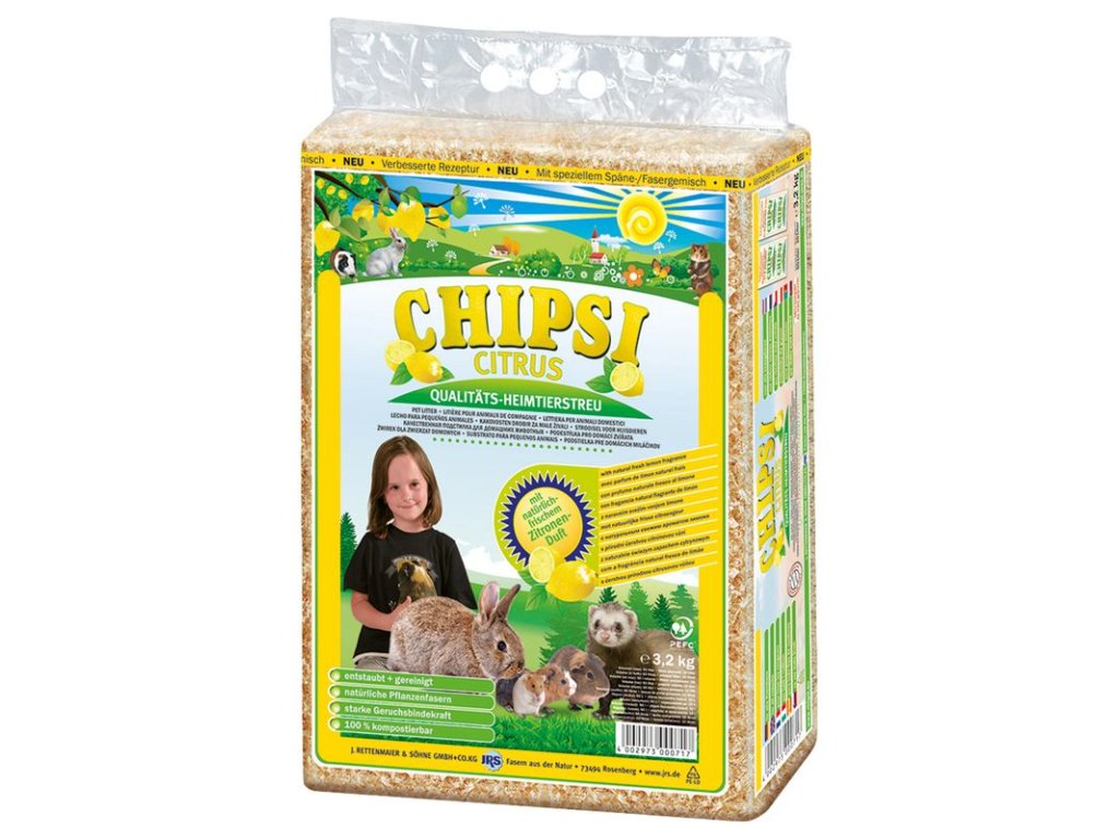 Hoblinová podestýlka JRS Chipsi Citrus je parfémovaná varianta lisované, sterilní a vysoce savé podestýlky s minimální prašností. Je určená pro drobné savce (křečky, králíky, morčata, krysy, myši a pískomily). Vyrobená je z měkkého dřeva a má svěží citrusovou vůni, která účinně pohlcuje nepříjemné pachy. Tato podestýlka neobsahuje žádné chemické látky.