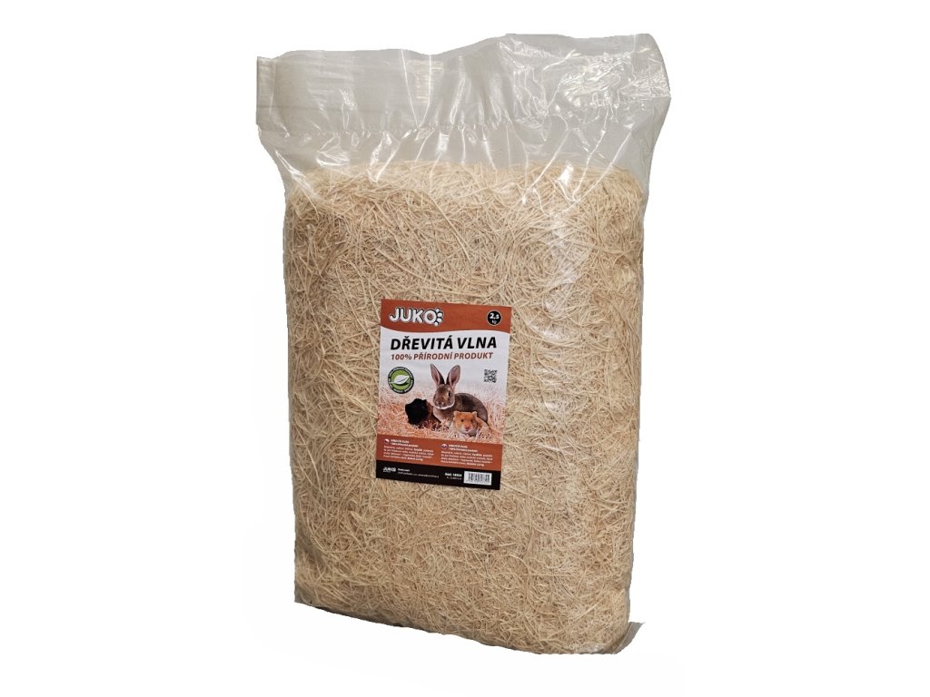 JUKO Dřevitá vlna (2,5 kg) je 100% přírodní a bezprašná podestýlka vyrobená ze surového dřeva, která je ideální pro psy, hlodavce, exotická zvířata a ptáky. Vyniká vysokou absorpcí pachů a tekutin a má teplo-izolační, antibakteriální a prodyšné vlastnosti. Je to ekologický produkt, který vydrží déle než sláma nebo seno, snadno se likviduje (kompostování, mulčování) a provoní domácnost příjemnou vůní dřeva.